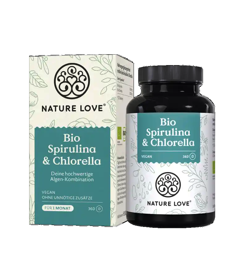 Algae are also called the "lungs of the ocean." You can think of them as a natural filter that ensures that pollutants are metabolized from the water. Pretty clever of Mother Nature! Nature Love offers two algae in one: Spirulina and Chlorella. Organic, of course. The vegan organic Spirulina & Chlorella tablets contain no unnecessary additives.