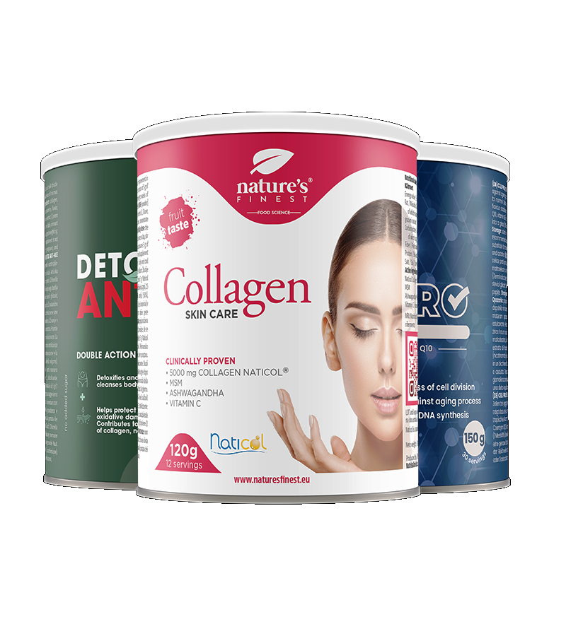 • Detox Anti-Age: With collagen, biotin, and vitamin C – contributes to the maintenance of normal skin and hair – Dual effect: detoxifies the body for weight loss and prevents oxidative cell damage