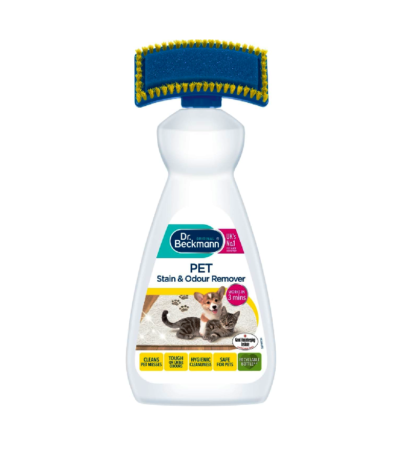 Dr. Beckmann Pet Stain & Odor Remover is the extra-strong solution for fresh and dried pet soiling. In just three minutes, this powerful cleaner eliminates unpleasant urine odors, vomit, feces, and paw prints, while ensuring a hygienically clean environment. It's also completely safe for your beloved pets. With its combination of a built-in cleaning brush and advanced oxidizing and odor-removing formula, it penetrates deep into stains, leaving your carpets looking clean and smelling fresh.