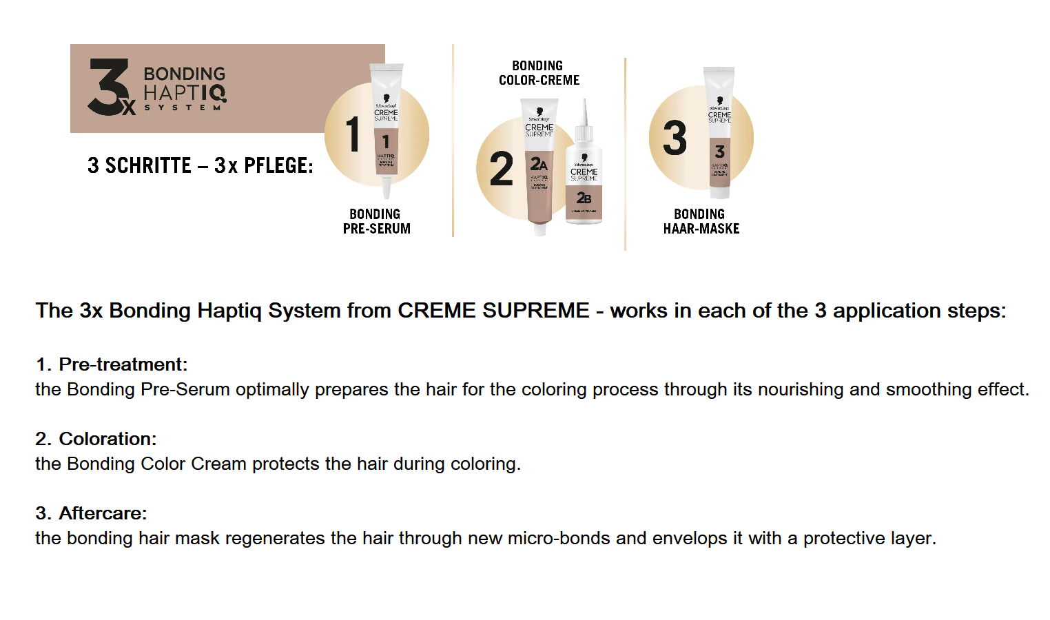 Schwarzkopf Creme Supreme Caring Coloration – With 3x Bonding HaptIQ System. The permanent coloration formula with 3x Bonding HaptIQ System protects against visible hair damage before, during, and after coloring, ensuring intense and even color results with 100% coverage.