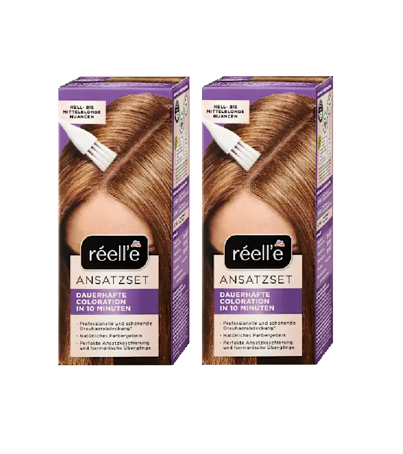 With the réell'e Root Color Set, you can quickly and easily conceal unwanted roots. The hair color provides professional gray hair coverage and natural color results from light to medium blonde, with harmonious transitions between natural hair and the color. The rich color shine treatment with natural almond oil provides the hair with valuable conditioning substances, smoothes the hair surface, and reduces hair breakage by up to 95%